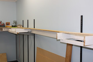 Sunday afternoon, I installed another joist along the back wall and the plywood for the track. The first section was the short piece still required to bring the track up to the start of the 5 foot long bridge. Then I installed the plywood base for the track along the back wall on the right hand side and the curve around to the right hand wall.